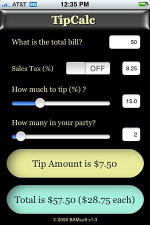 TipCalc ($1) from BAMsoft is yet another simple tip and bill splitting application with a mediocre interface.