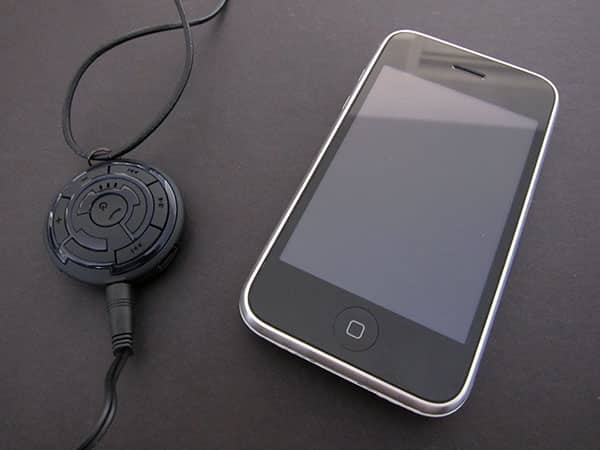 The plastic puck-shaped accessory hangs around your neck with one of two included straps, telling the time with a set of deliberately odd circular lights — seven for hours, 16 for minutes — adding a microphone, and providing access to play/pause and volume controls, a call accept/end button, as well as track-changing controls that may or may not work depending on the connected device.