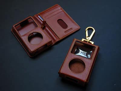 Tunewear’s new Sienna series PRIE Tunewallet Sienna for iPod 5G and nano, Ambassador for iPod 5G and nano, and Tunetag Sienna for iPod nano are remakes of the company’s previously released and reviewed products of the same names, now offered in “rich caramel” Nappa leather rather than the white and black leathers we’ve previously tested. A gold-colored metal is used for Ambassador’s included metal hooks rather than the silver-colored previous metal, and matching brown belt clips are included as well. Each case comes with Tunewear’s Tunefilm protectors, which are necessary more on the 5G cases than the nano ones; other than the fact that the Tunewallet 5G we received came with nano film instead of 5G film, the cases were as impressive as before, perhaps a little more.