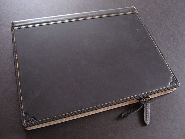 The spine looks just like that on an old book, with more gold accents including the phrases “BOOK BOOK” and “VOL XII,” the latter of which represents the company’s name. It would fit in perfectly with other tomes on a shelf. A zipper takes up the remaining three-quarters of the edge, with a pair of pulls attached to brass rings.