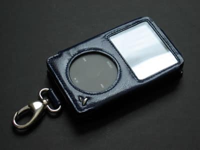 Made with the same premium leather we’ve come to expect from Vaja, the Classic AP197 case features a prominent metal lobster claw-style hook, and your choice of 14 different standard (Aniline) colors – single-toned only – or 12 additional Vitelino options at a $6 premium. Our Vitelino sample case has a beautifully glossy finish and highly attractive blue (Azzurro) coloring. A screen protector is included, and as always, Click Wheel protection, name/logo personalization, and matching leather lining are optional.