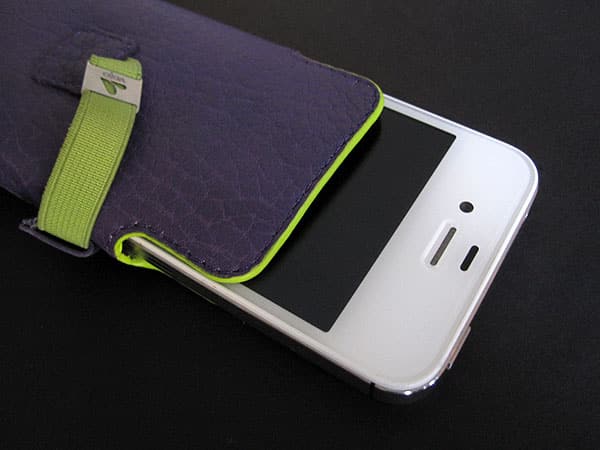 Made of truly impressive soft leather—customers have the option of either floater leather with a large-grained texture or the flatter plain material—the case enables the iPhone to easily slip in and out as needed; it’s tight enough to hold the iPhone securely without inhibiting removal. The pouch provides complete front and back coverage with the sides enclosed to the point just below the level of the volume buttons and the top left mostly exposed. An elastic strap holds the iPhone in place with a small piece of leather in the center acting as a buffer.