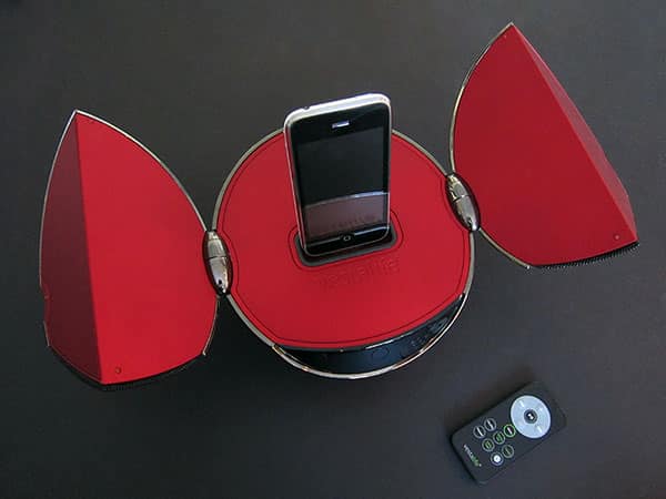 As we noted in two earlier reviews today, Vestalife is one of the most gifted industrial designers making budget-priced iPod and iPhone speakers today: its original Ladybug was a sensation, and has now been followed up by two great sequels called Ladybug II and Firefly. But there’s another new member of this family of globe-shaped, fold-open audio systems: Mantis ($180) is Vestalife’s largest and priciest speaker unit, boasting what the company claims to be “a sound quality experience that compares with speakers twice its cost.” Unfortunately, Mantis doesn’t live up to that particular claim, so even though it incorporates the same improvements found in its lower-priced sister speakers, it’s not a system we’d recommend with equal enthusiasm.