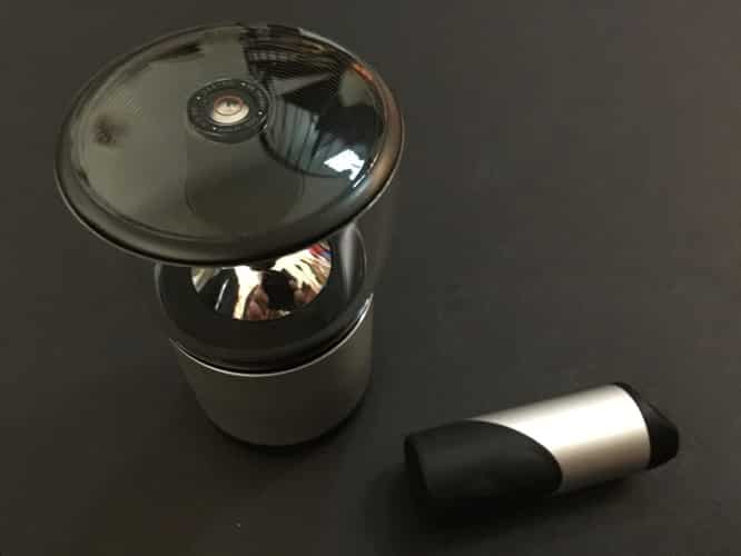 Though V.360 Camera appears fragile at first — the high price tag probably contributes to that idea — looks can be deceiving. The shockproof, IP67-rated camera can be submerged 1 meter underwater for up to 30 minutes. V.360 is roughly 4” tall, and about 2 5/8” in diameter at its widest point.