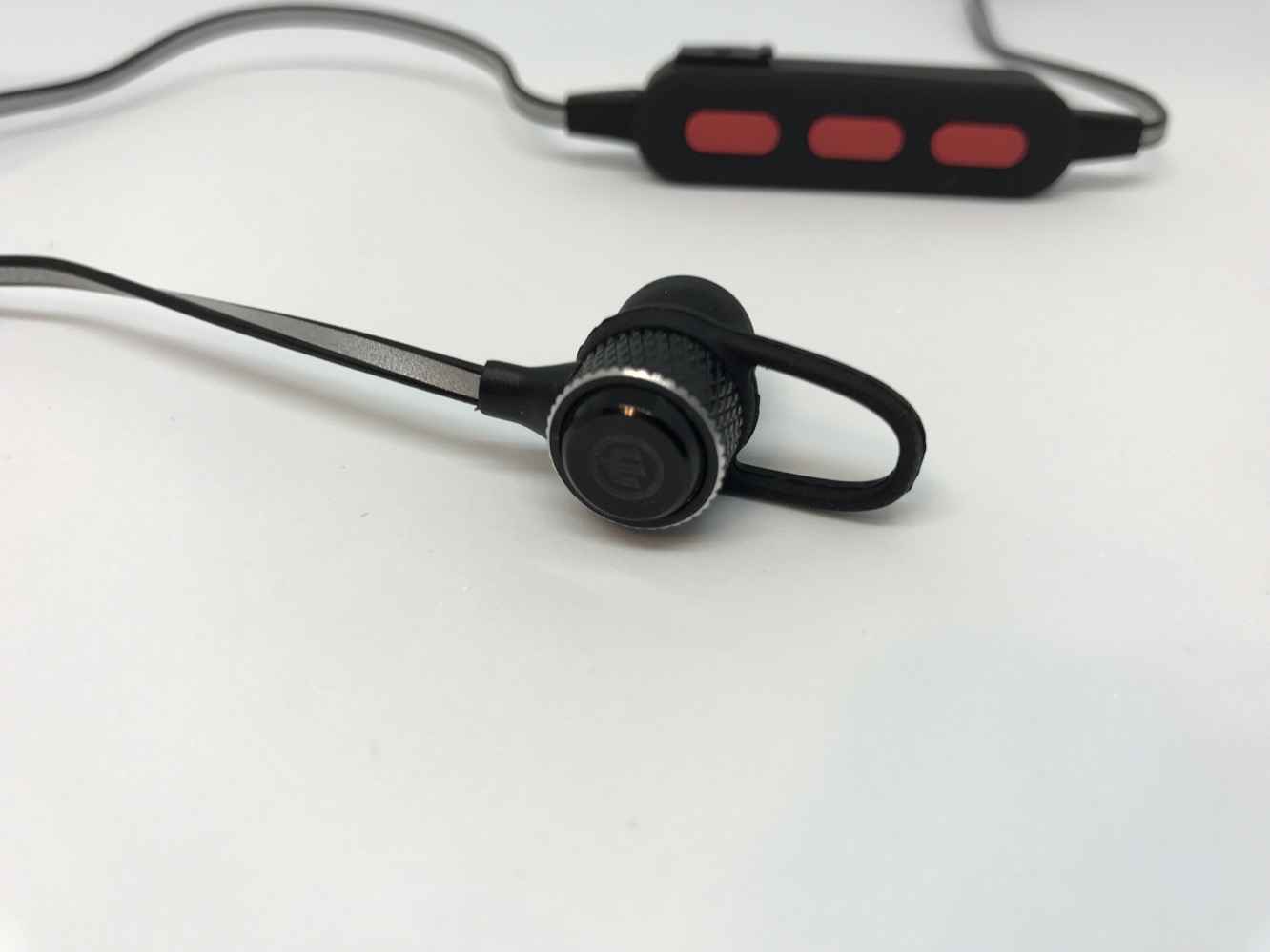 In addition to a charging cable and alligator clip, the Shred Wireless ships with an array of silicone accessories to ensure a good fit — three sizes of silicone in-ear tips and three sets of silicone wings (including a unique U-shaped set). We found it easy enough to get the Shred to stay put, even with its rather large control pod hanging from our right ear — the pod is light, but takes up a lot of volume, so it’s prone to getting stuck on shirt collars.