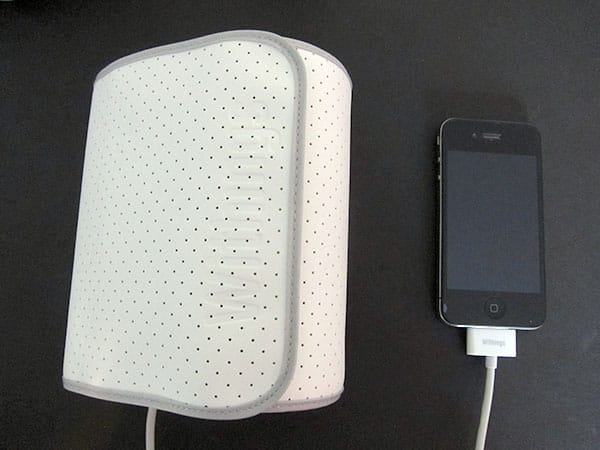 We need to mention several positives about the Smart Blood Pressure Monitor’s design at this point to put our single major criticism into the proper context. First, because Withings uses a Dock Connector cable rather than a full dock to connect to iOS devices, it avoids the huge mistake iHealth made: this accessory works fully with virtually any iPod, iPhone, or iPad case out there, so there’s no need to pull your device out of its shell to use it for a quick blood pressure test. Second, by moving the components into the tube, it makes the unit very easy to fold up and carry around, though a little heavier to wear during the test process.