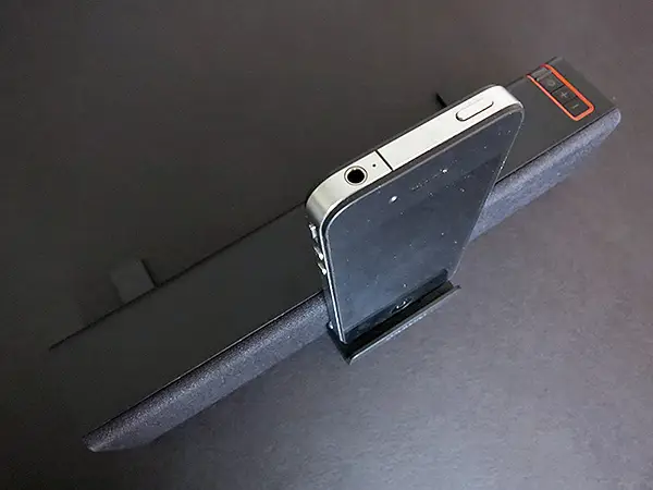 Soma Travel’s concept is solid. Measuring 9.8” long and 2” tall, the matte black plastic unit has just enough size and weight to be able to support iPads and iPad 2s inside its pop-out front dock, using flip-out bottom feet for added stabilization on a table. The Dock Connector plug inside is flexible enough to accommodate some iPad/iPad 2 cases—results will definitely vary on a case-by-case basis, with thinner cases more likely to work than others—and generally works quite well with iPhone and iPod cases.