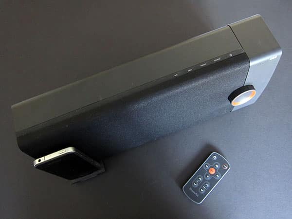 The story with Soundfreaq’s SFQ-01 Sound Platform is somewhat similar, though Soundfreaq is new to the iPod/iPhone accessory world, and its implementation is at least a little different in almost every regard. Soundfreaq has designed a system that is hard to place in terms of visual style or theme—made predominantly from glossy black plastic, it has some of the starkest lines of any iPod or iPhone audio system released to date, yet each is offset by an accent of some sort that prevents the system from looking underthought. The front, for instance, is a black slab of fabric with a thin silver line above, and a thicker silver and black pedestal below. A dock sits at the center, with three swirled metallic sound tuning controls on the left, and concave track, volume, source, power, and pairing buttons on the right. Turn the system to the right and you’ll find a storage compartment for the included ten-button Infrared remote, illuminated with an orange light bar that’s paralleled on the similarly glossy but permanently closed left side. The back is vented, letting the system’s Kevlar-reinforced drivers breathe.