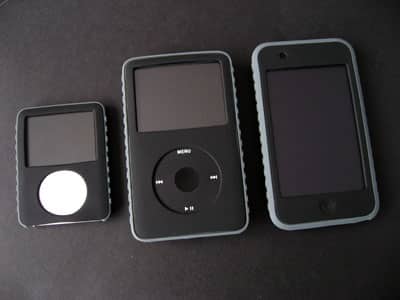The two-tone rubber case concept isn’t unique to XtremeMac, but it’s especially well executed here: each case offers a stylish combination of silicone rubber, augmented with included clear film protection. The iPod nano and classic versions both come with screen and partial Click Wheel protectors—missing center Action button covers—while the iPod touch version comes with a face protector, which when paired with the rubber case provide very substantial body coverage. XtremeMac offers the nano and touch versions in two different color options, while the iPod classic version is available only in the black/gray version shown here, sold separately in 80GB- and 160GB-tailored versions.