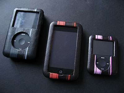 The core idea behind all of these cases—four colors are available for the nano, with two color options for the classic and touch—is to cover most of the iPod save for its screen, controls, and ports with a leather-wrapped hard shell similar to ones we’ve been testing for years from Vaja Cases and its lower-priced cousin, Case Mate. Here, the twist is that the leather is vertically striped rather than just a single color, except for one of the nano cases, which is all black but for a pink rear flower; XtremeMac also offers the nano case in a plain olive green canvas material rather than leather.