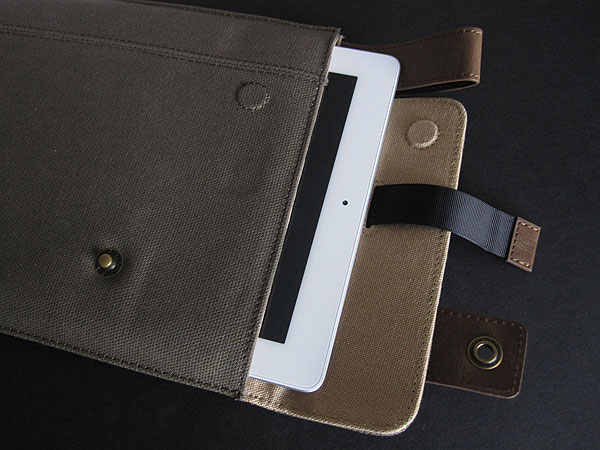 Vintage Sleeve is made of reinforced waxed canvas, offering an earthy, military look. The outside is olive green while the inner lining is tan. XtremeMac went with the less common vertical orientation with an opening and flap along one of the short edges. It’s held in place with a metal snap connected to a faux—but very real looking and feeling—leather tab, and magnets underneath.