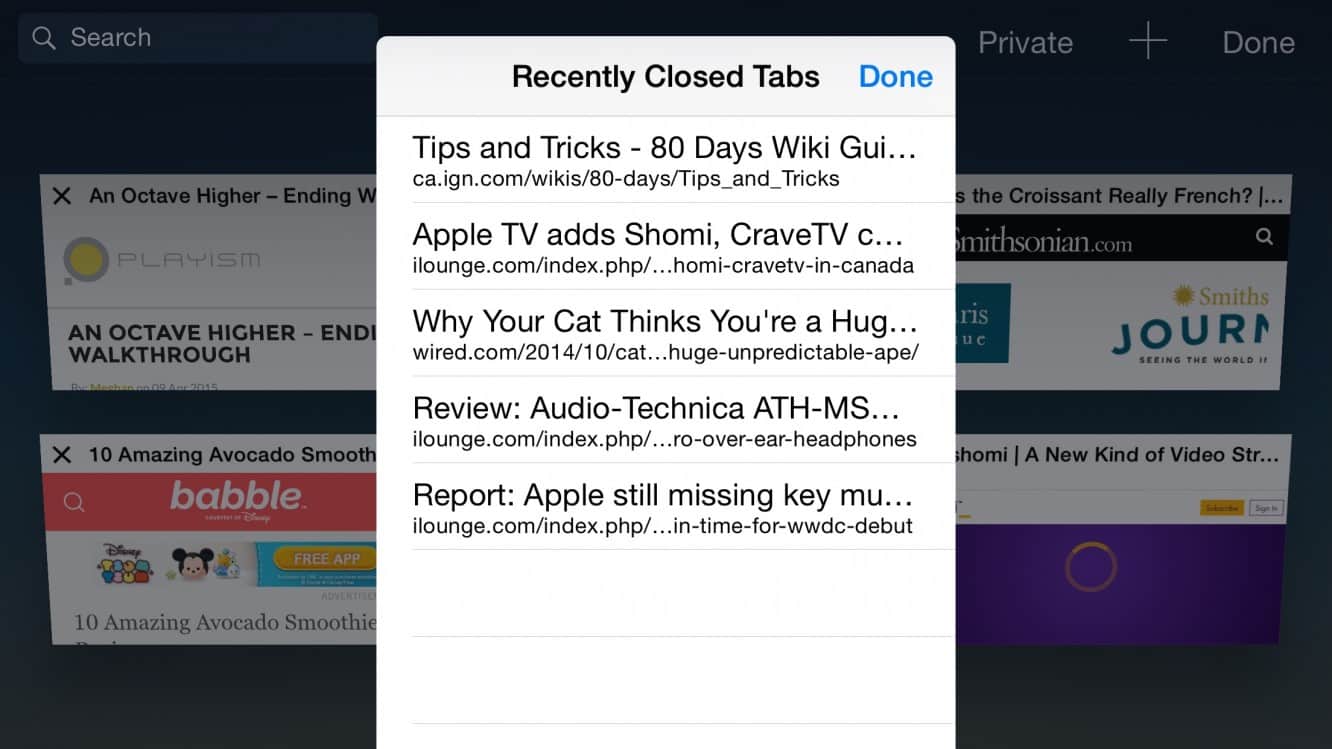 While fans of Chrome will know that it provides an obvious way to get at your recently closed tabs via a list right in the history screen, the good news is that Apple hasn’t forgotten to include this feature in Safari either — they’ve just hidden it well. If you tap and hold on the “+” button normally used to open a new tab, a “Recently Closed Tabs” list will pop up.
