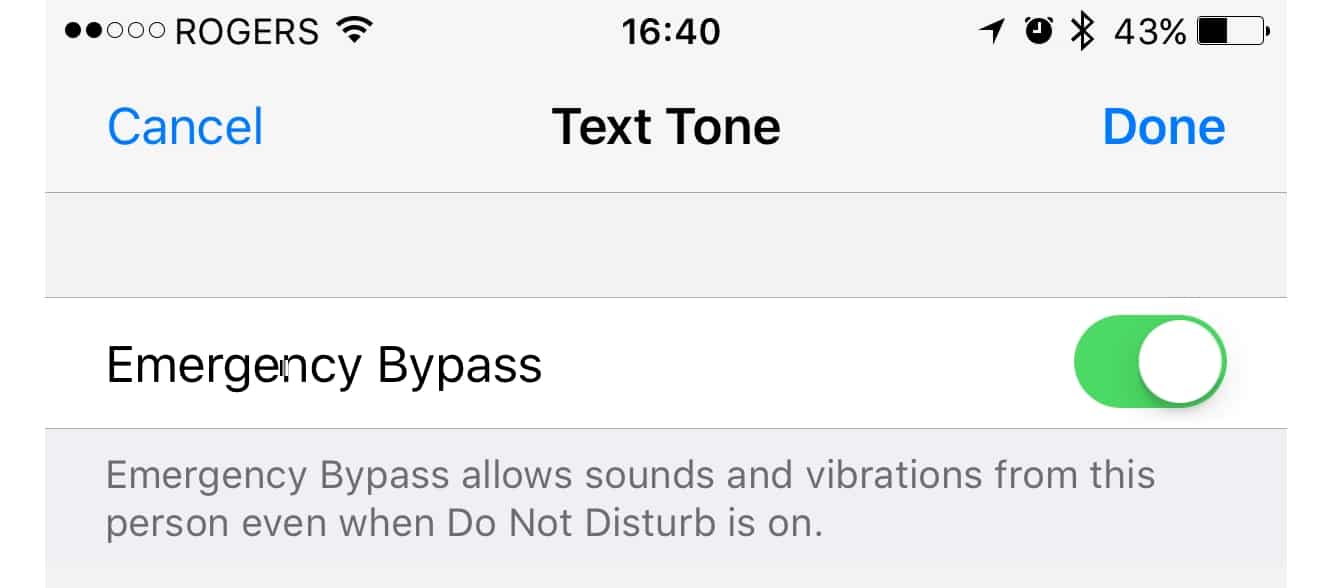 When editing a contact, tap on Ringtone or Text Tone in the contact record; a new Emergency Bypass switch now appears at the very top of each vibration/tone selection screen, which can be toggled on to indicate that sounds and vibrations from calls or messages from that contact should come through even when Do Not Disturb is otherwise enabled.