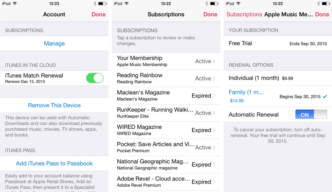 You can do this at any time before the trial ends, but if you forget to do so, you’ll be stuck paying for at least one month of service before you can cancel, so now is a good time to decide whether you want to keep Apple Music or not. If you decide you’re not willing to pay for it, you can disable the auto renewal feature in much the same way as any other app-based subscription, by viewing your account via either iTunes or your iOS device and disabling it from the “Manage Subscriptions” screen.