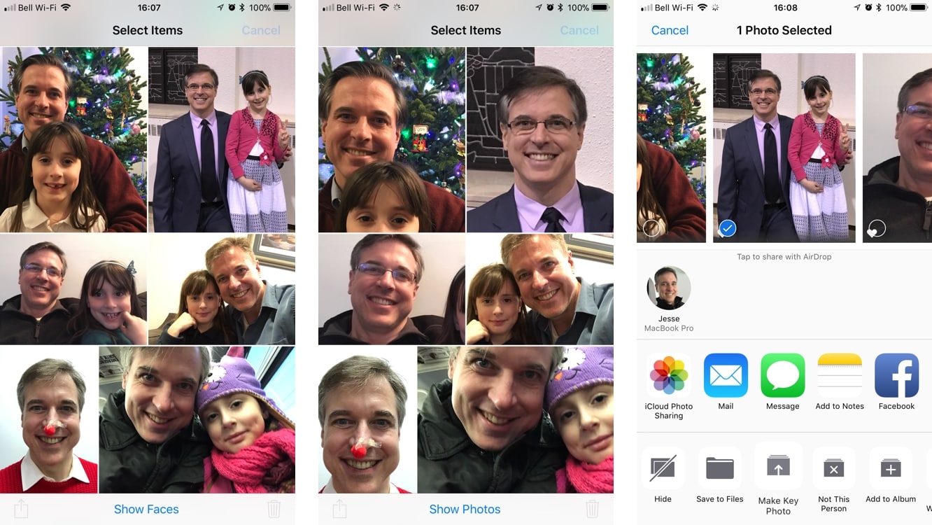 At the bottom of that person’s photos, tapping “Show Faces” will zoom in on the person’s face in each photo. To set a new key photo, tap the “Select” button in the top right corner, find the photo you want to use and tap on it to select it, and then tap the sharing button.
