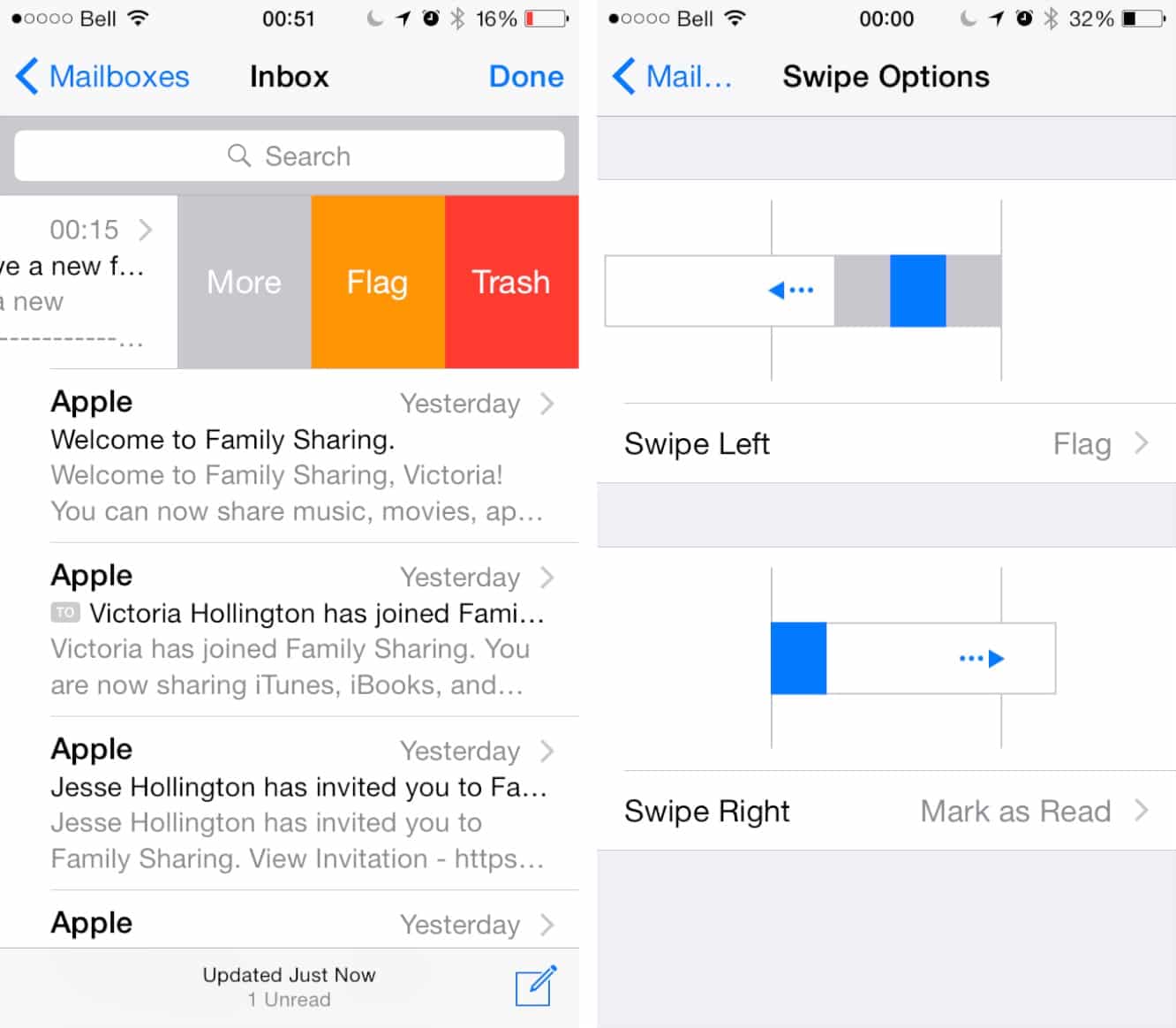 Simply take a trip into the iOS Settings app, and in the Mail, Contacts, Calendars section you’ll find a setting for “Swipe Options”; from here you can choose to have the swipe-left gesture show a Mark as Read/Unread or Flag button, and the swipe-right gesture can be customized to Mark Read/Unread, Flag, or Archive the message.