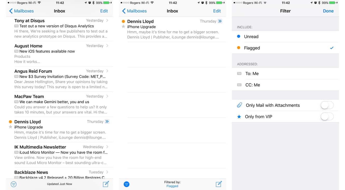 Your last used settings are retained and will be used the next time you apply the filter, so you specify whichever criteria you most commonly filter by, and then just toggle the filter on and off with the filter button in the bottom left corner. While this feature is similar to the Smart Mailboxes introduced in iOS 7, it has the advantage of being customizable on the fly, and working in any folder that you happen to be viewing, not just the Inbox.
