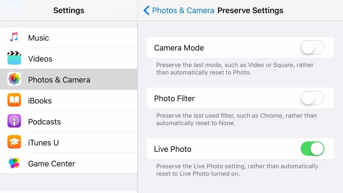 Preserve Settings under Photos & Camera in the iOS 10.2 Settings app includes three new toggles that let you choose: whether the camera saves the last capture mode (e.g.