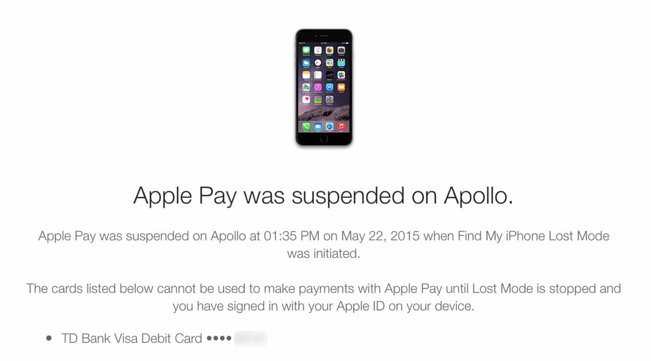 When your iPhone or other iOS device is back in your hands, you can unlock it with your normal passcode or password and then enter your Apple ID password when prompted to turn off Lost Mode and re-enable your Apple Pay cards. Note that this does not affect your ability to use your actual physical credit or debit cards; only the virtual cards associated with Apple Pay on that specific iOS device are suspended.