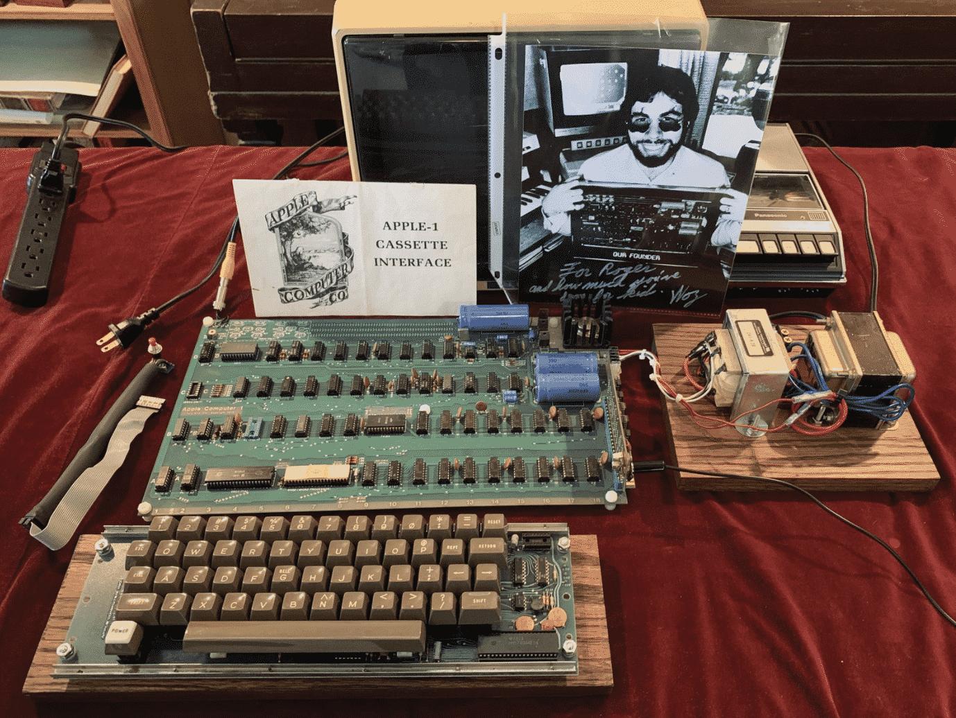 The Apple-1 computer comes with the original operating manual pages, Apple II keyboard, a Panasonic Portable Cassette Player and Recorder, Cassette Interface and cassettes and the original board.