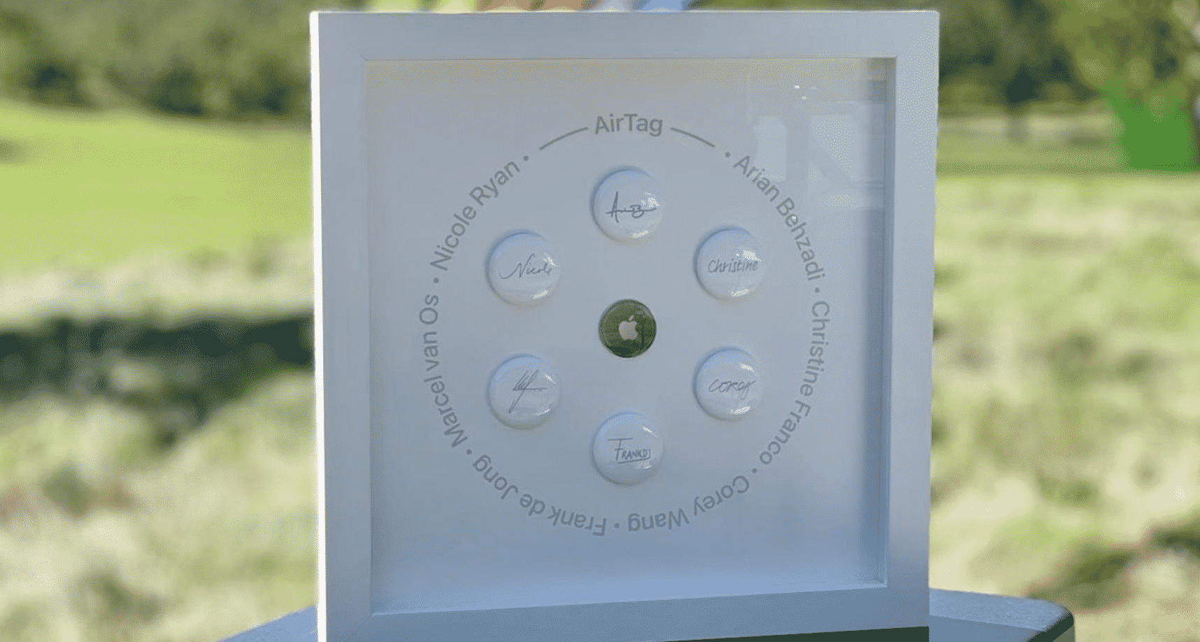 Apple employees who worked on the design of the AirTags were presented with a special item- a commemorative case with six AirTag trackers forming a circle and surrounding an AirTag cover. The trackers have the designers’ signatures and the cover has the Apple logo.