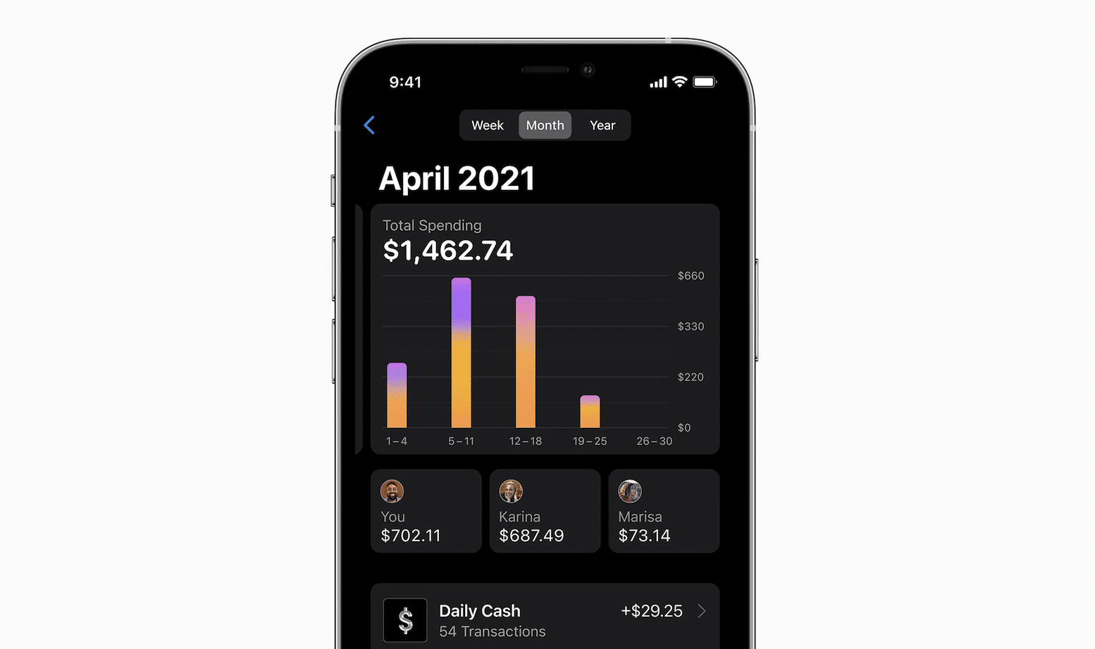 Apple Card Family allows the main cardholder to share with family members aged 13 and above. The Wallet app on the iPhone gives the cardholder individual spending tracking and spending access. Shared experience gives each user the ability to earn Daily Cash on their accounts. Daily Cash can be transferred to another bank account or to pay the balance on the Apple Card.