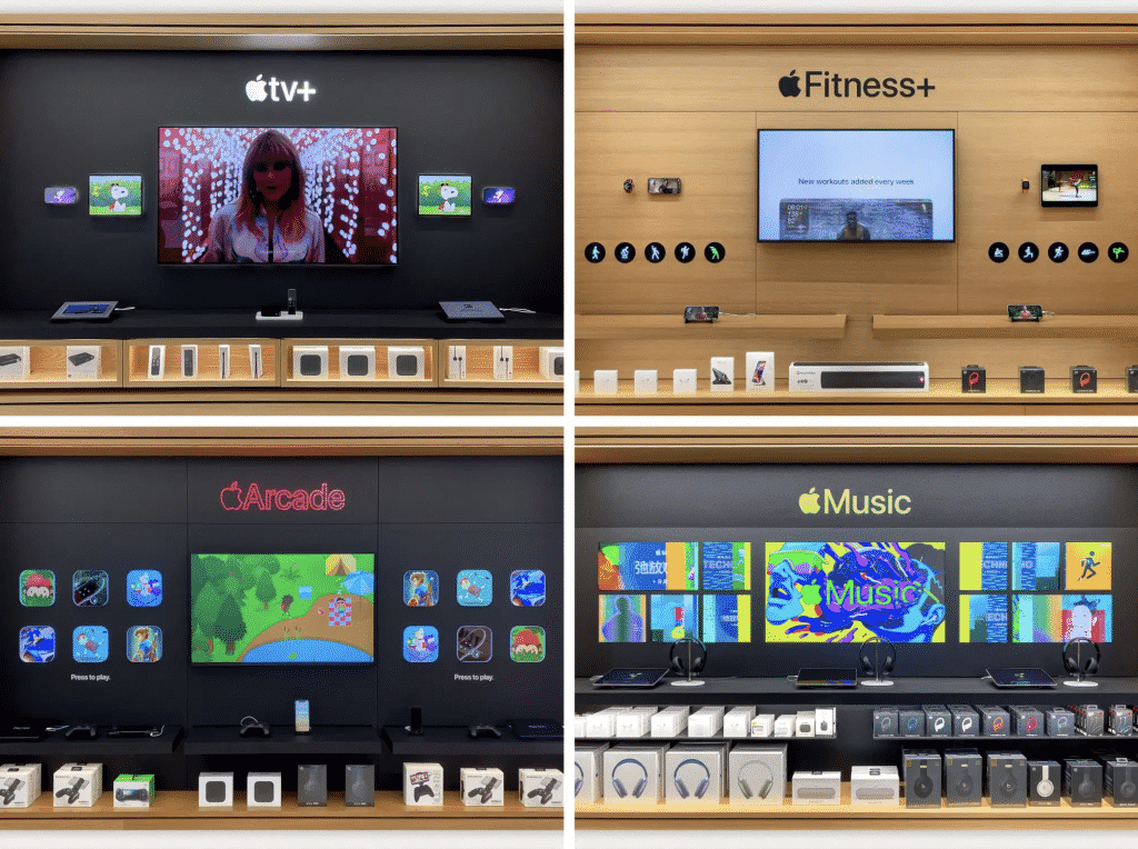 Apple Stores around the world have been steadily focusing on Apple subscription services. Inside, signs that highlight several of Apple’s services, such as Apple TV+, Apple Arcade and Apple Music are prominently displayed.