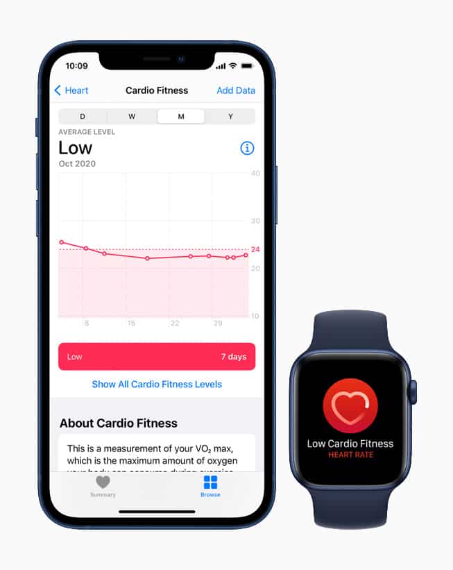 The Health app on the iPhone will display the cardio fitness level of the user. Also, if the cardio level falls below a certain level, the user will receive a notification on the watchOS stating the same and asking them to up their game.