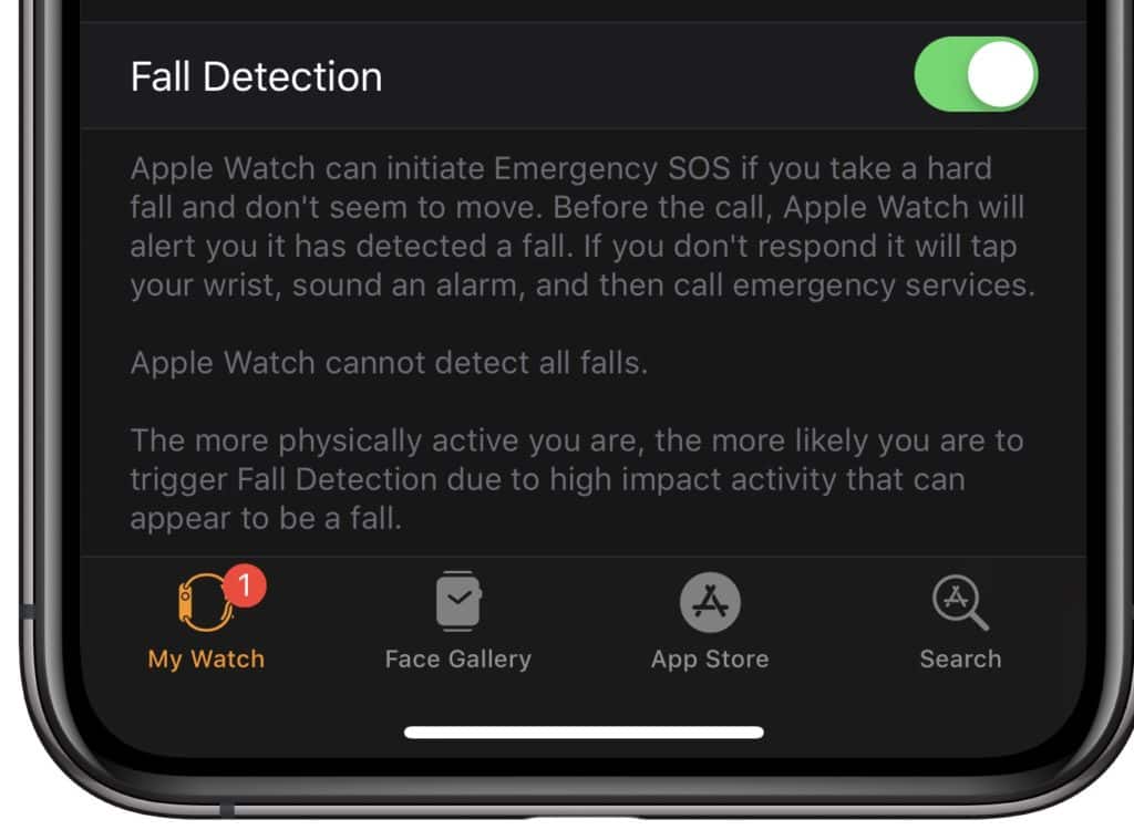 Fall Detection in Apple Watch must be manually activated for those who are under 65 years of age via the Watch app. The feature activates when a sudden fall happens, and automatically dials emergency services if the owner doesn’t turn off the notification within a minute. The assigned emergency contact receives an SMS and a location of where the fall happened during the time. Pressing the side button and holding it will also activate emergency services.