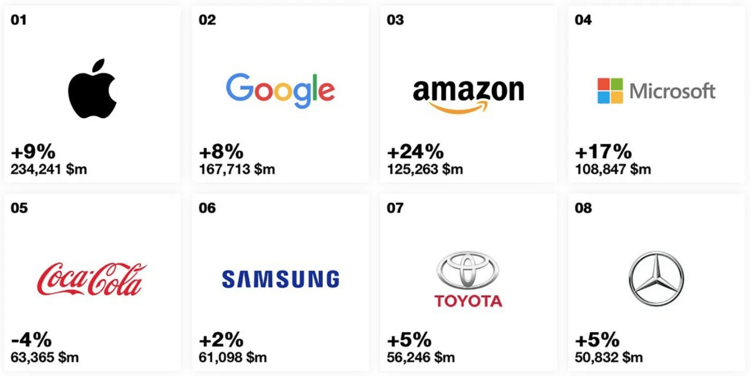 Apple has gone up 9% as compared to last year’s value. The brand is now worth $234 billion, solidifying itself as the world’s most valuable in the category.