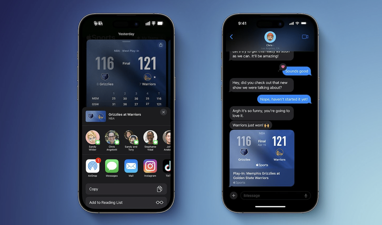 Game Card sharing allows for sharing and generating game cards for supported leagues and matches that have been completed, are upcoming, or are live. The cards can then be shared on social media or iMessage, among other platforms. The immediate application of Game Card sharing is with the NHL and NBA, as the season is currently ongoing, but Apple plans to extend it to Formula 1, MLS, and MLB, among others.