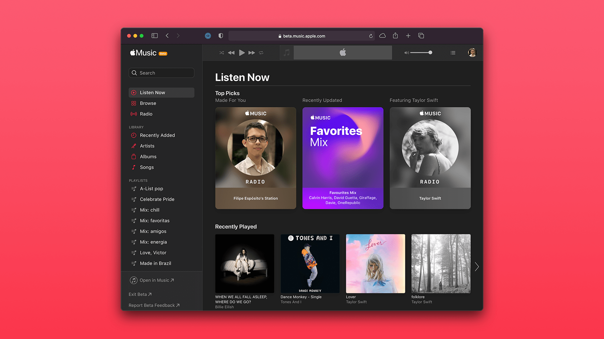 Those who visit the beta web version will find that the design is also overhauled to follow the changes on Big Sur and iOS 14’s Music app. Also, Mix playlists have animated artwork and sidebar icons are now in red.