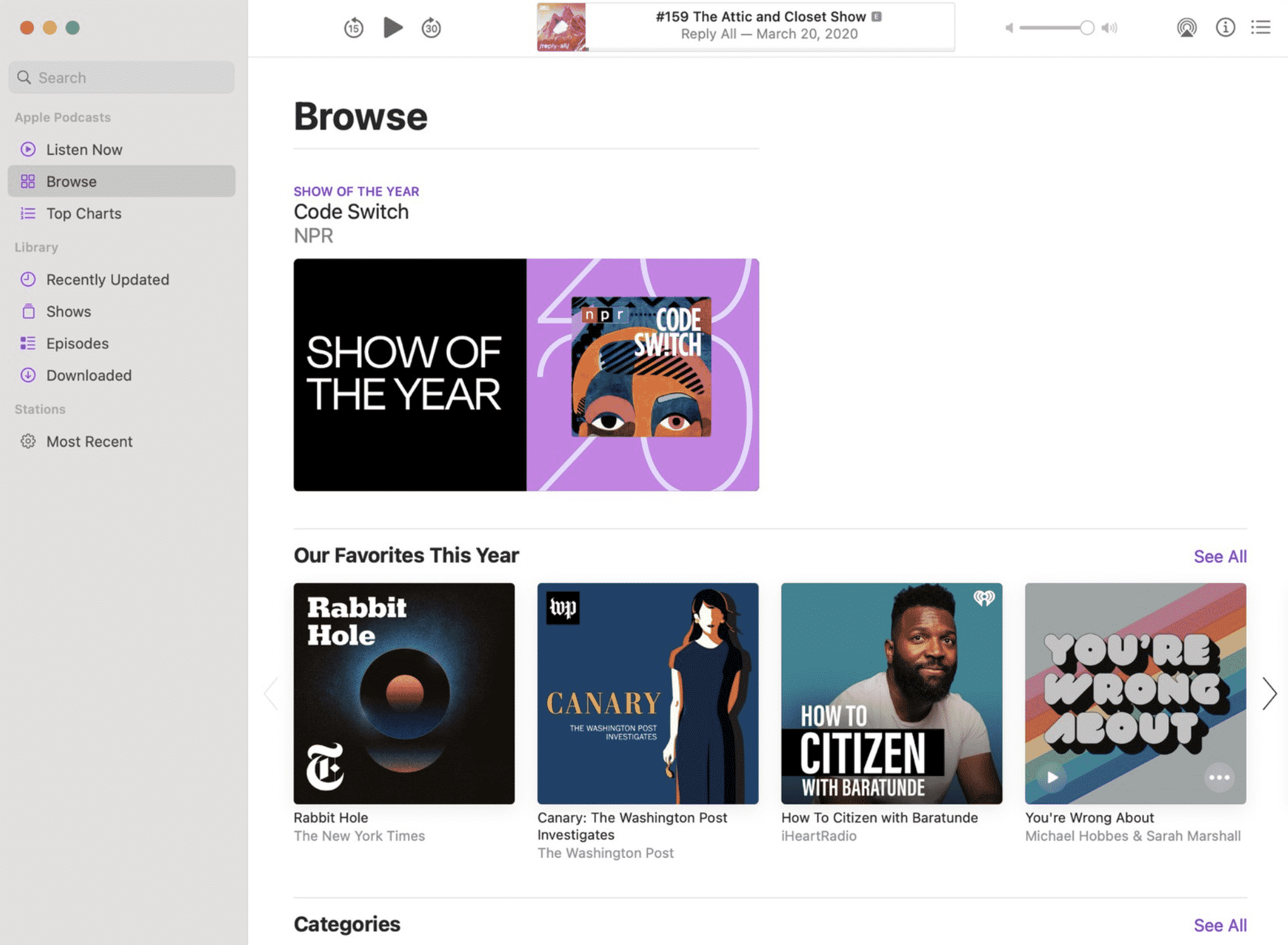 Podcasts: Show of the Year was given to NPR’s ‘Code Switch‘, while new show recommendations include Red Ball, CounterClock, Nice White Parents, Unlocking Us and more.