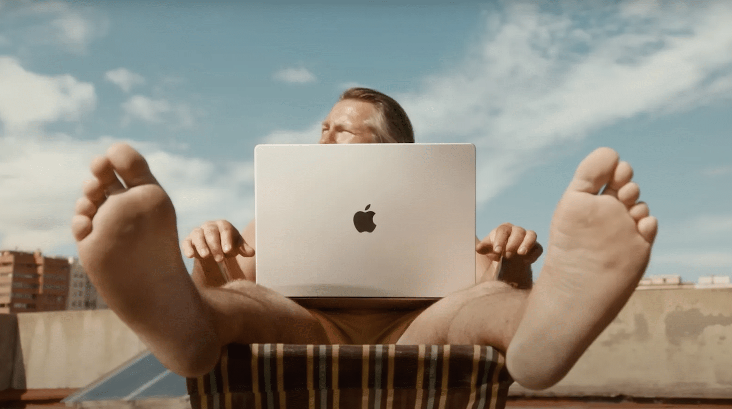 ‘Bronzed’ is only 36 seconds in length and tells the story of a man reclining on a chair with his Mac on a rooftop. The sun is beating down and there are all kinds of glare reflections from tall buildings and shiny objects. When the camera focuses on the MacBook Pro, there isn’t any glare or reduced visibility, thanks to the nano-texture display. The latest MacBook Pro has a nano-texture add-on to offset bright indoor lighting and direct sunlight for an additional $150.