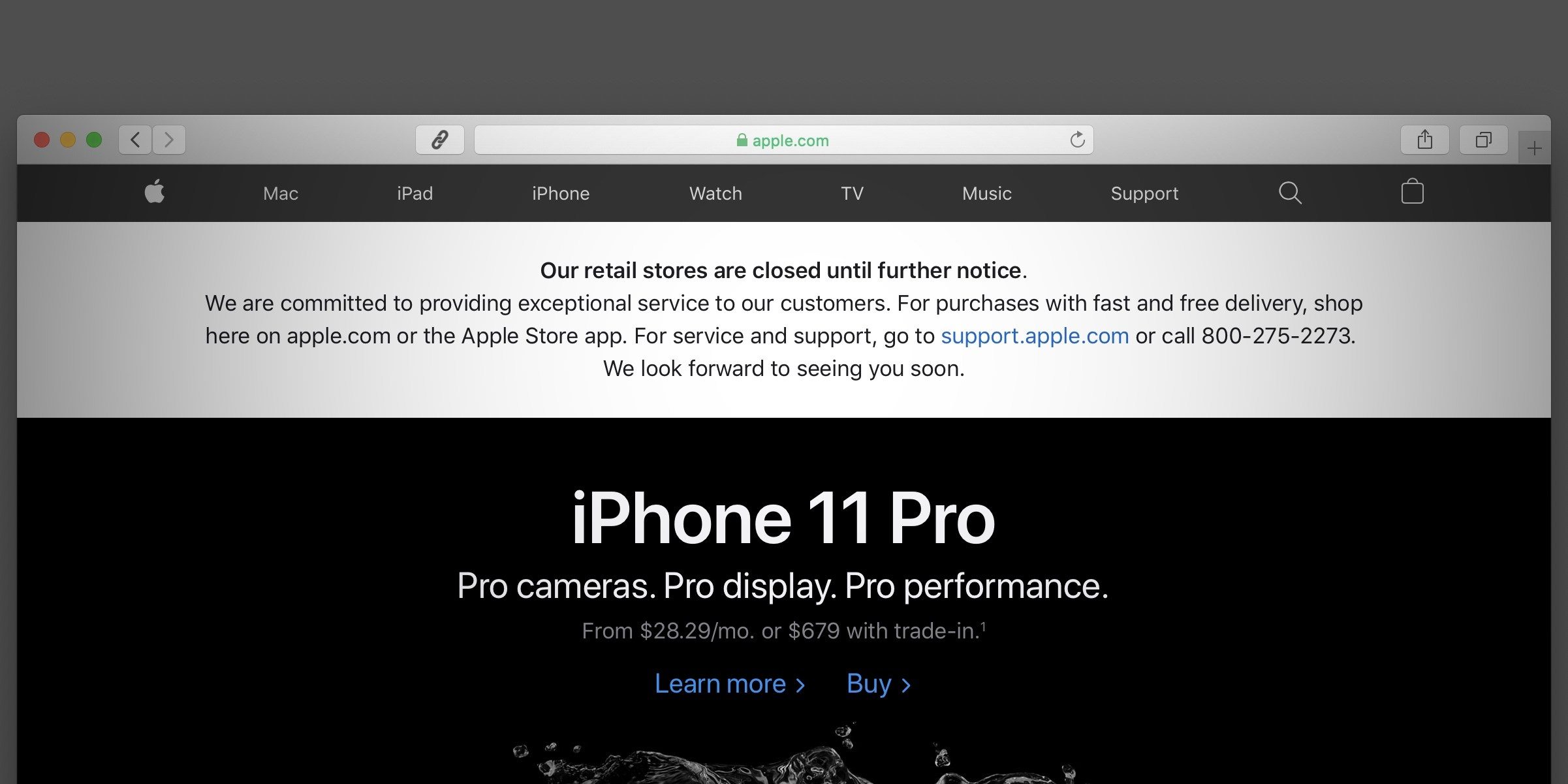 The Apple.com homepage says, “Our retail stores are closed until further notice.”