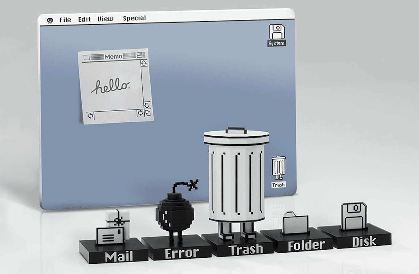 The set include a whiteboard that’s similar to a Mac desktop, a Memo Pad, a mini figure that looks like the ‘Error’ icon, and Mail, Folder, and Disk desk accessories. They have tiny magnets that can be attached to the whiteboard. Furthermore, the Disk, Folder, Mail, Error Bot, and Trashbot have distinctive stands with name tags.