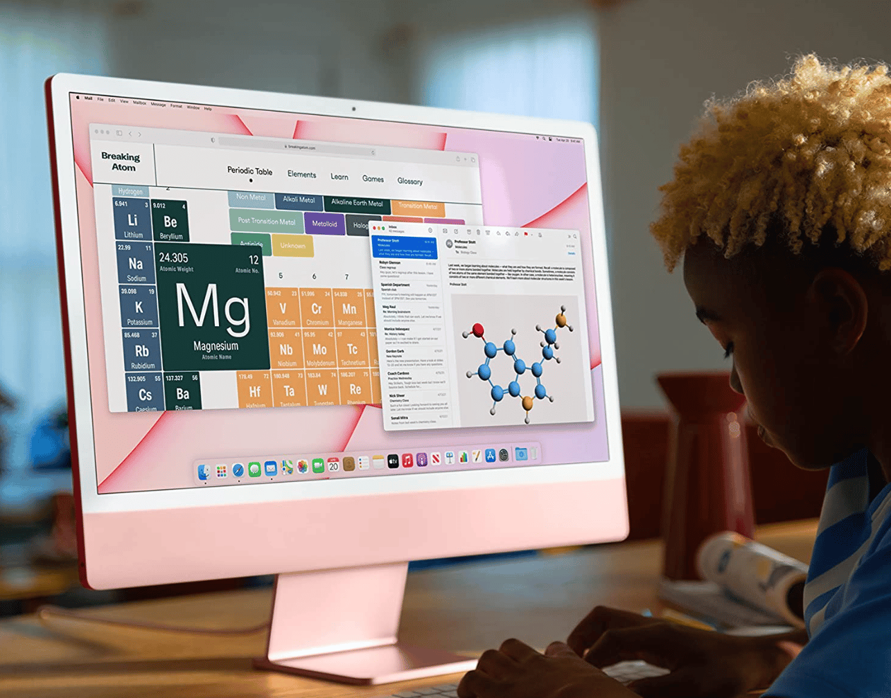 The iMac supports direct iPhone or iPad app installation, and comes with two USB-4 ports, Bluetooth 5.0, a headphone jack, and WiFi 6. Included is a 3-mic array, 6-speaker sound with Spatial Audio, and an HD FaceTime camera. Last but not least, you can choose from seven different colorways to suit your personality and style.