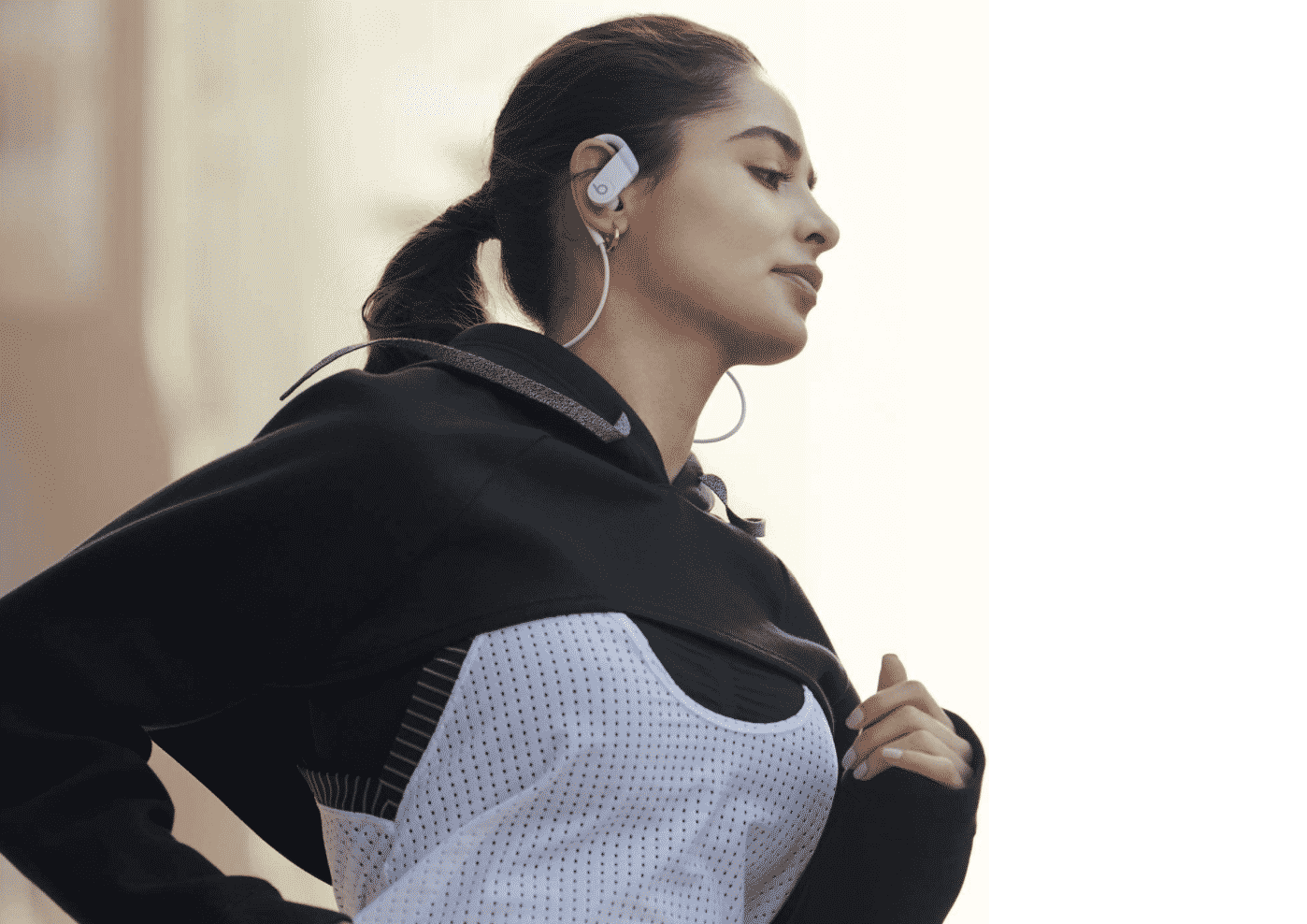 Powerbeats’ offering touts the Apple H1 headphone chip, bringing with it improved connection speed, fewer dropouts and longer range. More importantly, the headphones stick in your ears even as you move and complete high intensity exercises and movement, thanks to the adjustable earhooks and snug eartip fit.