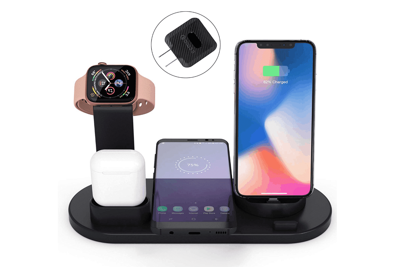 The charging dock can charge multiple Apple products simultaneously. You can place your Apple Watch, AirPods and iPhone and get fast charging capacity anytime, all without needing cables. The dock comes with intelligent protection such as over-charging, over-temperature, over-voltage and over-current for peace of mind. There’s also an interface charging for USB C, micro USB or Lightning.