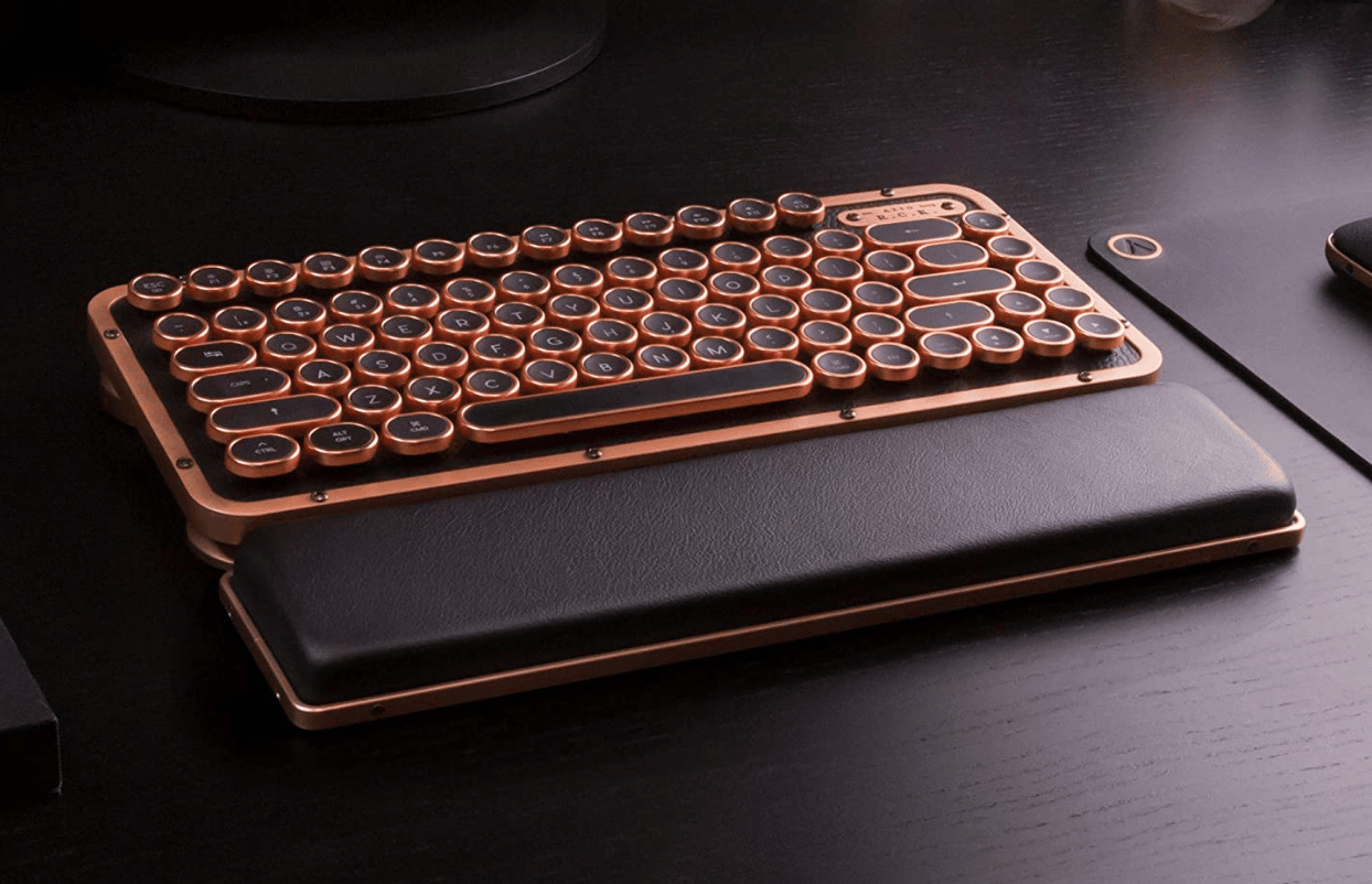 Mechanical keyboards have that superb tactile feel that isn’t seen on traditional keyboards. Instead of squares and boring colors, you get rounded keys that have a shiny copper border, and a leather top plate that’s simply marvelous. The chrome finish is great on the eyes.