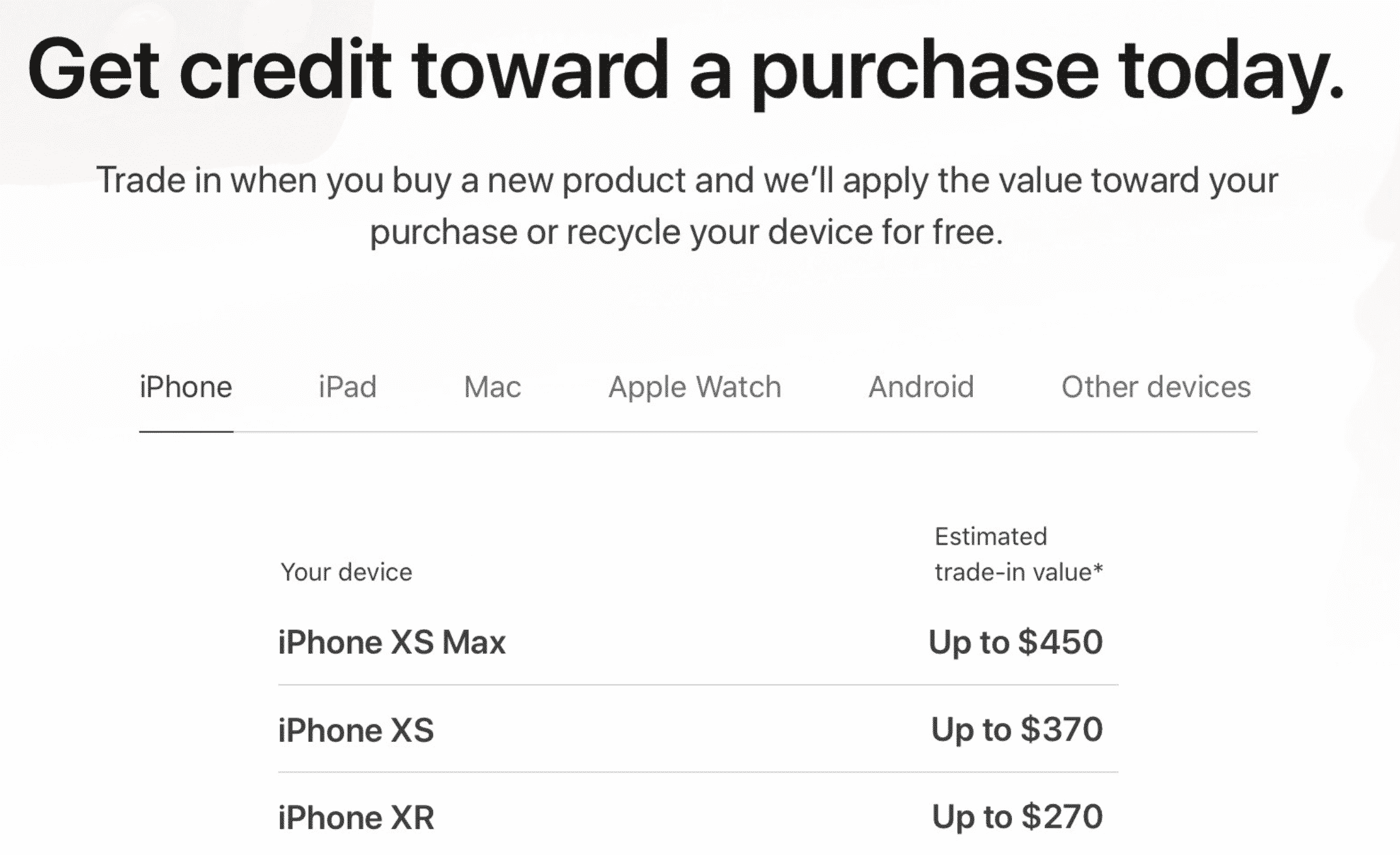 According to Apple the price of the most recent models has dropped by $30 to $50. Other models have dropped by $5–$20. There are a few models that have seen no change in the trade-in values.