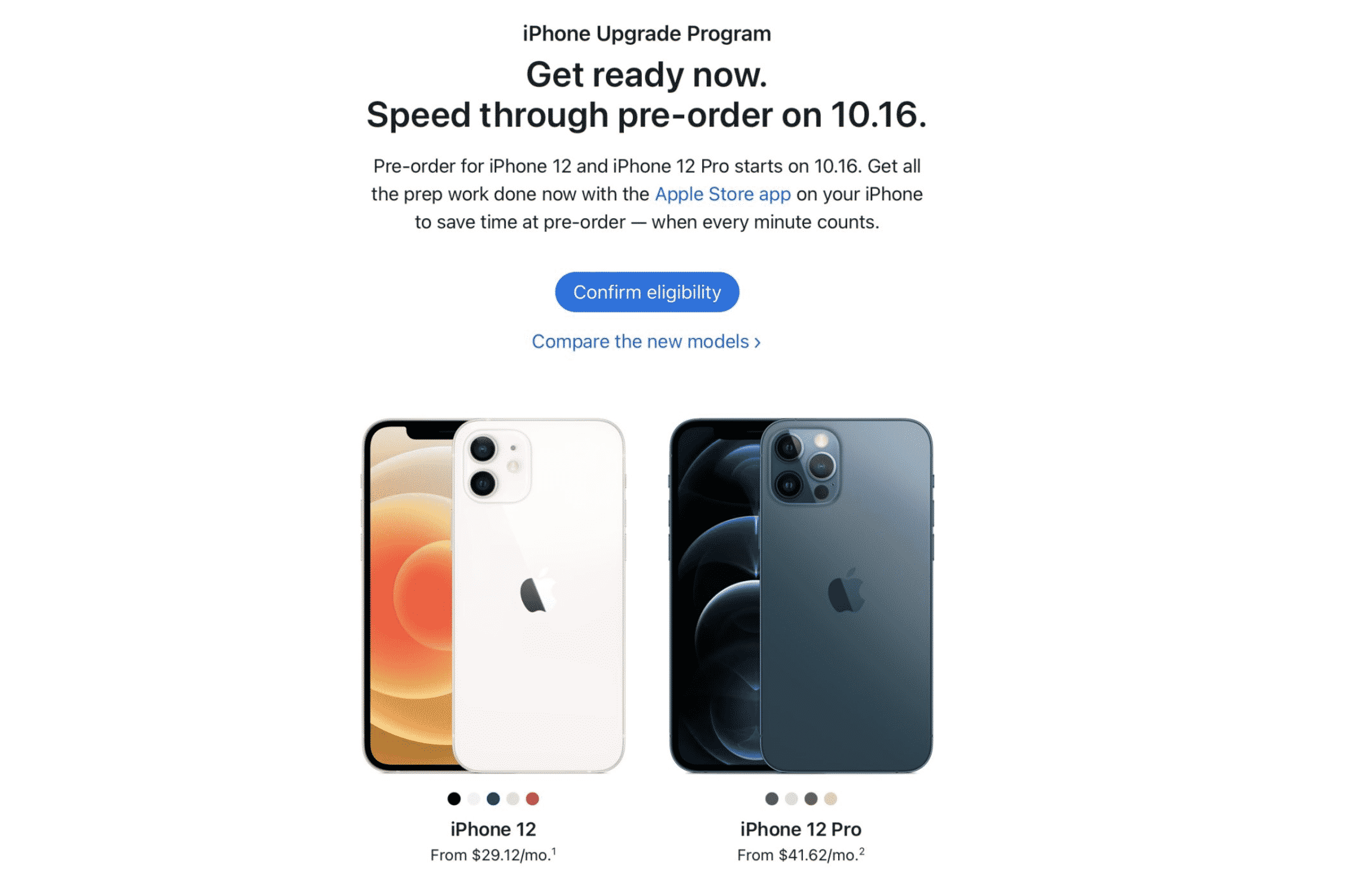 The trade-in offer usually appears before going to the payment options page. Afterwards, the site will ask if you wish to pay a monthly fee or in full. AppleCare+ coverage will be offered when ‘pay in full’ is selected. If ‘get ready for pre-order’ is picked, the page opens up options to add accessories, confirm a carrier and choose the preferred method of payment.