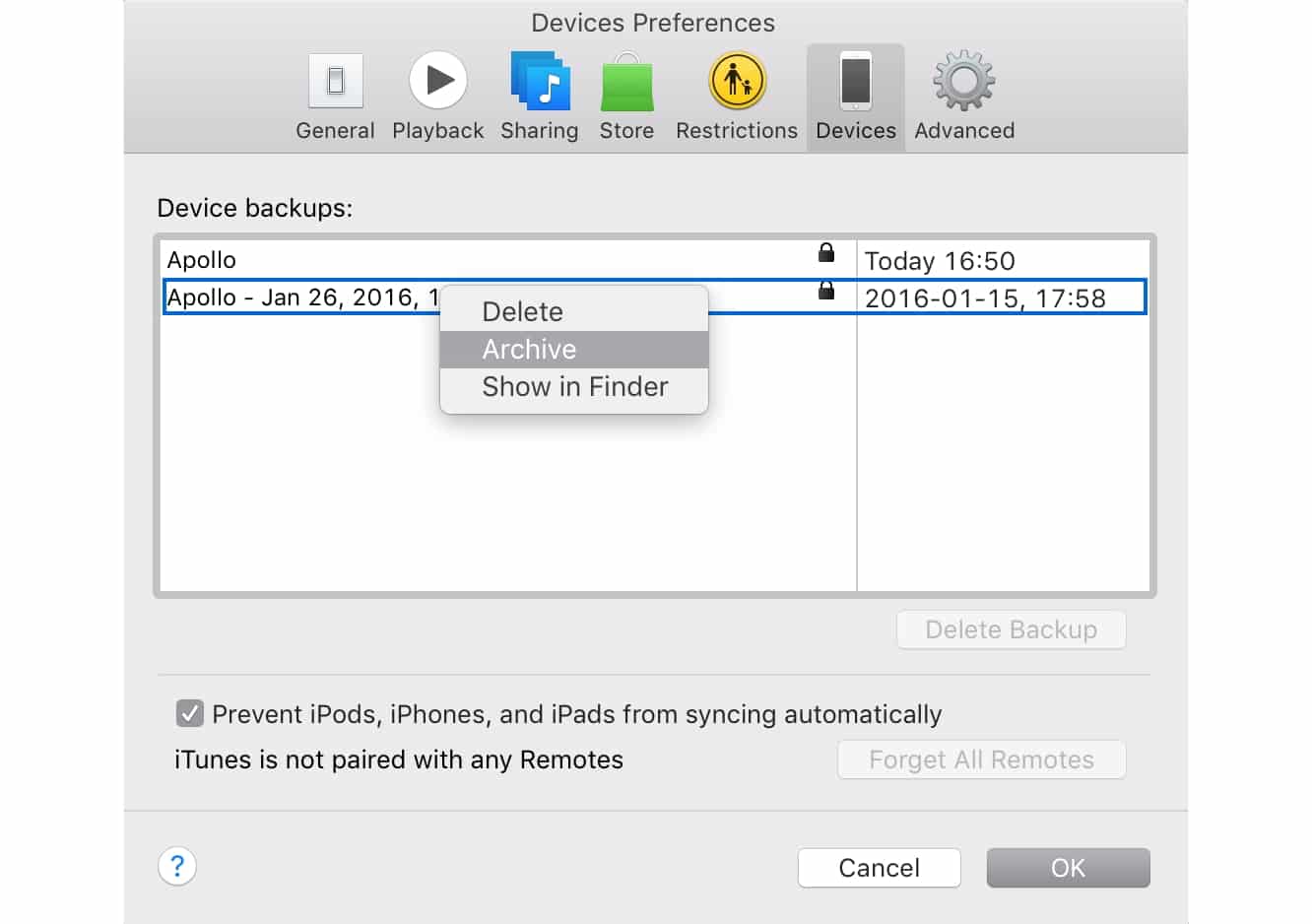 Managing iOS device backups in iTunes