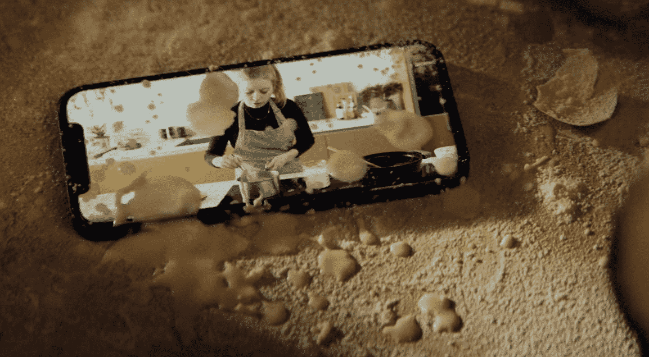 The iPhone 12 is shaken, dropped, slammed, covered in ingredients and more. By the end of the ad the iPhone 12 is washed off with running water under a faucet.