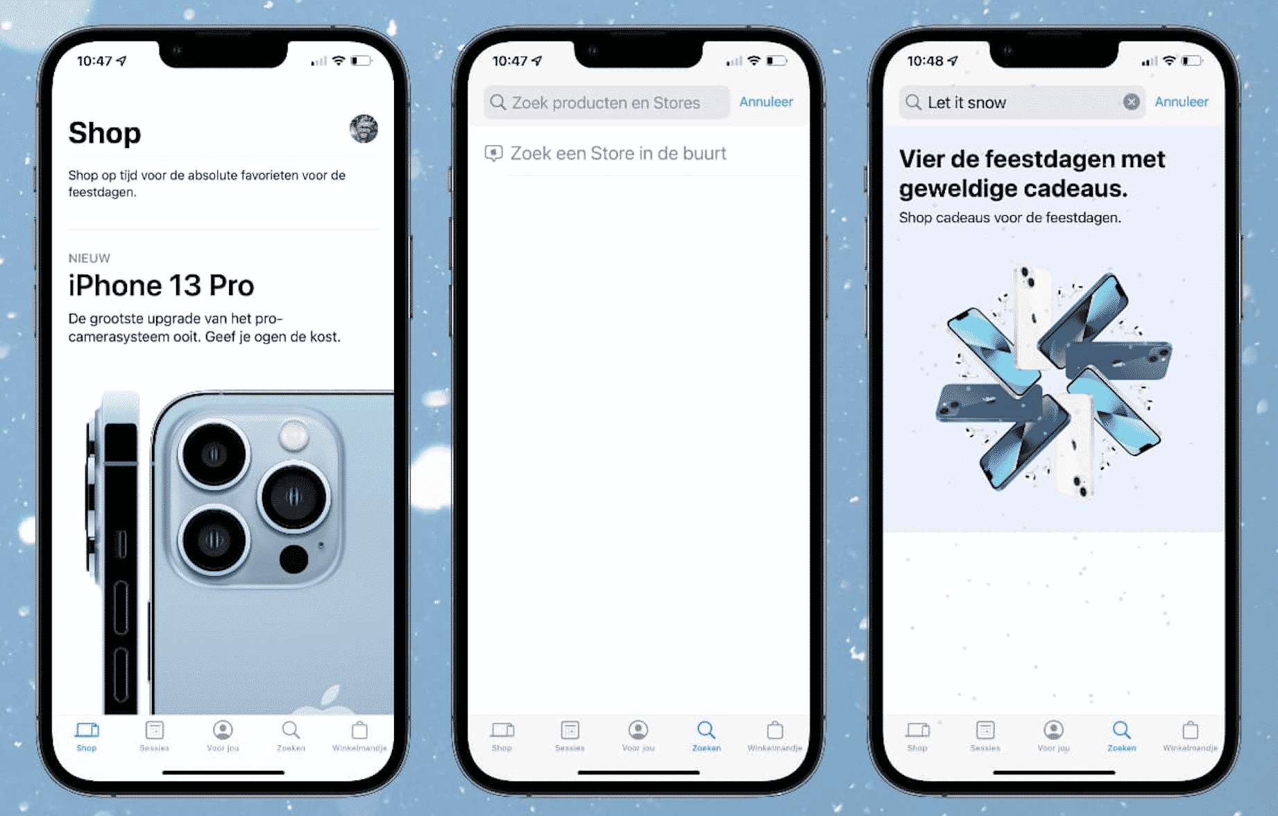 Once the keyword is entered the virtual shop will display small snowflakes falling down. Users can continue to shop as this happens. The effect is slightly different between Light and Dark mode, and it’s persistent even as the user switches pages. Also, whenever the device is shaken the falling snow swirls around and mimics the effect of a snow globe.