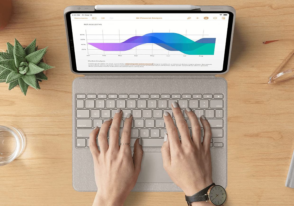 The combo folio keyboard and case is aesthetically pleasing and offers several degrees of protection. When closed, your iPad Pro gets full-time, 24/7 protection from dings, scratches, and light spills. However, the keyboard case shines when it’s open and ready for work or play.