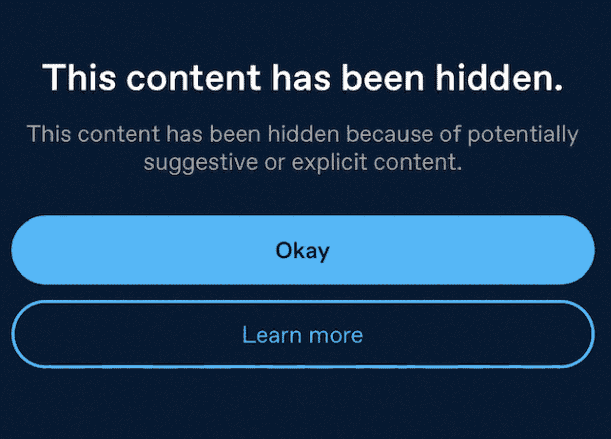 After entering a blocked search term the app will show an error screen, ‘this content has been hidden because of potentially suggestive or explicit content’. Tumblr did reveal release notes saying that ‘beginning in v22.5.1, sensitive content will be hidden’ in the App Store.