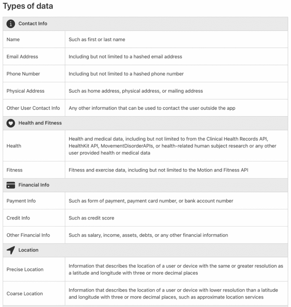 Apple summarizes the app privacy details that developers must create in the document. Among them is an example of data types the app may collect, and which ones are shared with partners.