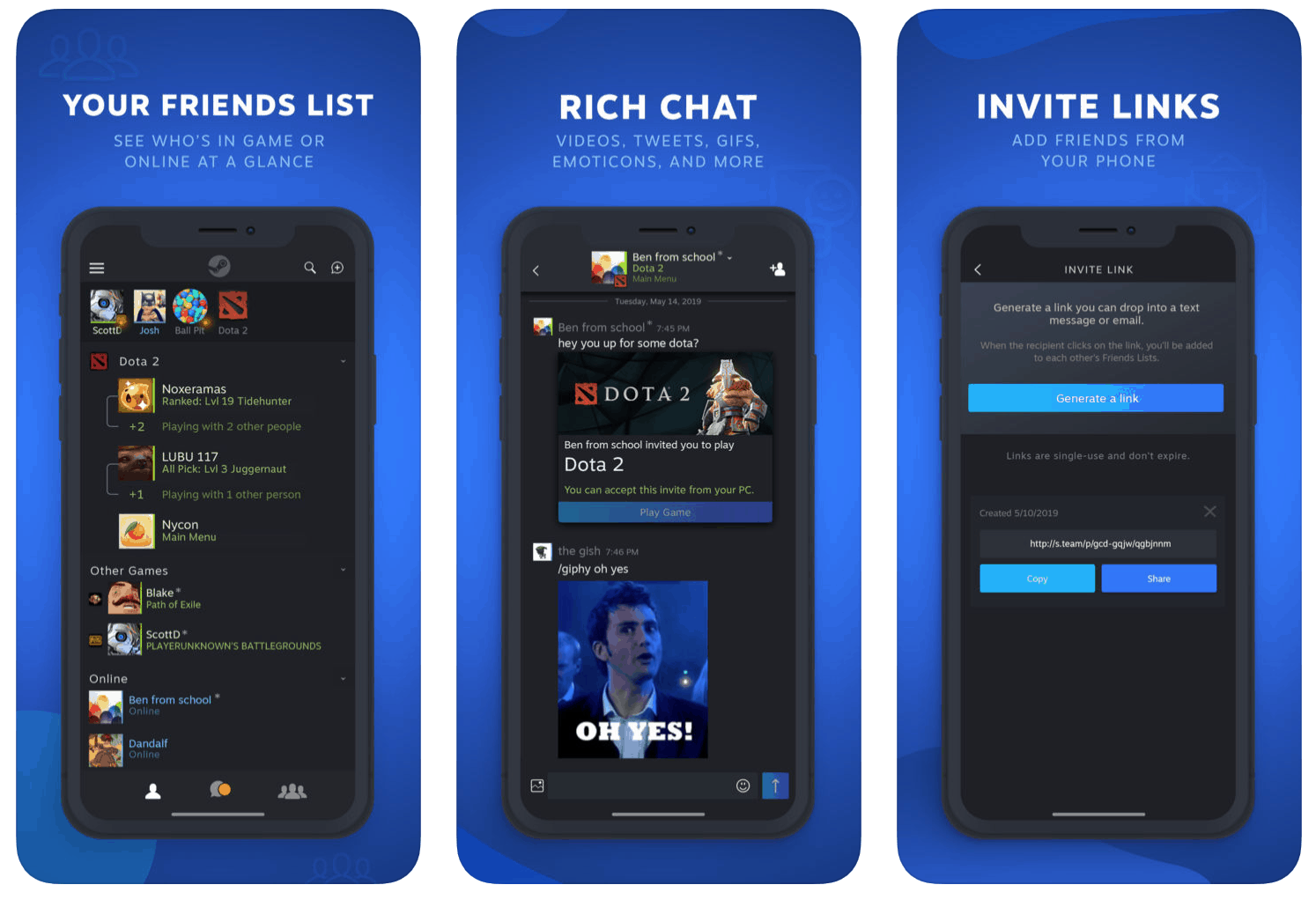 - Generate Invite Links that can be sent via email or SMS to add new Steam friends.