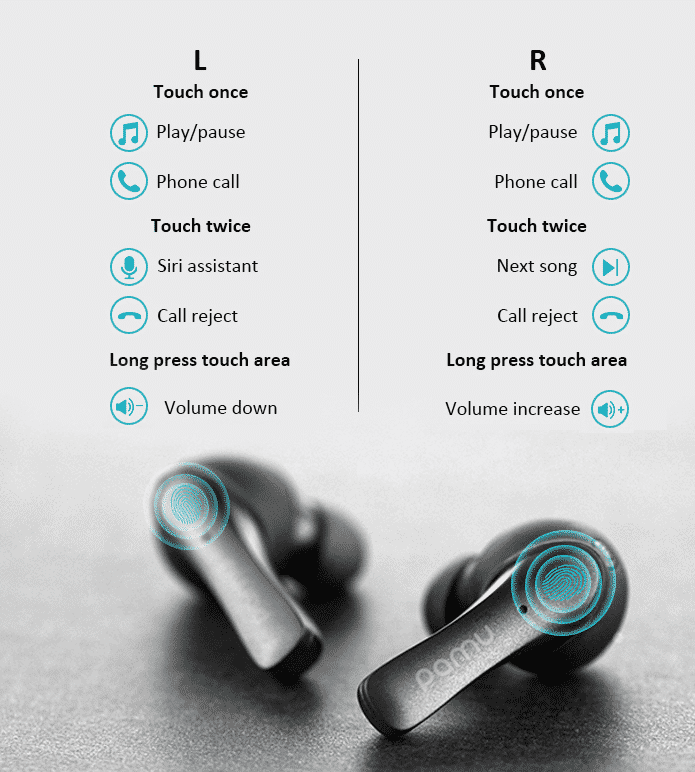 Each of the earbuds has touch technology that allows you to play or pause music with a single touch. Check out the following image of its touch features: